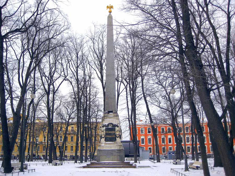 Проект сооружения впервые возник ещё при Екатерине Великой в 1795 г., однако финансы были выделены лишь спустя три года Павлом I. Изначально сооружение стояло на Марсовом поле рядом с Летним садом и Ломбардом, позднее оно было перемещено ближе к Мраморному дворцу ввиду появления там другого памятника — Александра Суворова. После оформления в 1818 году Суворовской площади, обелиску снова пришлось искать новый дом, и тогда выбор пал на территорию бывшего плац-парада перед Первым Кадетским корпусом (ныне здание Меншикова дворца).