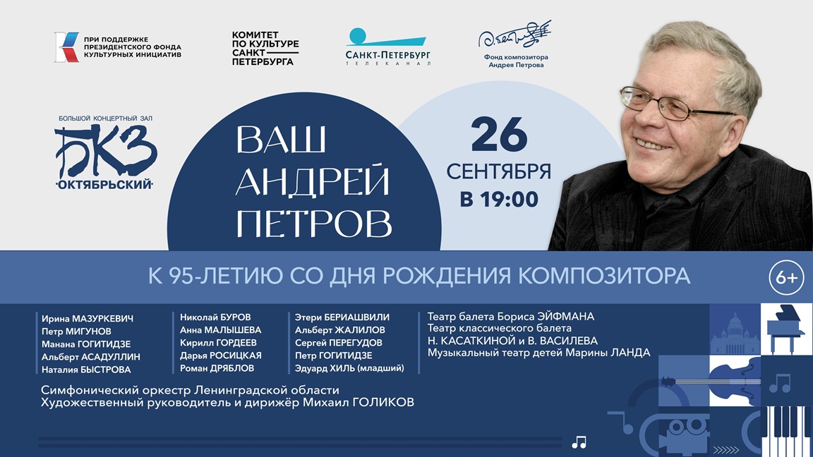 В 2025 году вся страна отмечает 95-летие со дня рождения Почётного гражданина Санкт-Петербурга, Народного артиста СССР, Лауреата Государственных премий композитора Андрея Петрова. Концерты музыки этого композитора, которую любит и знает всякий, кто когда-либо её слышал, уже проходят от Калининграда до Владивостока.